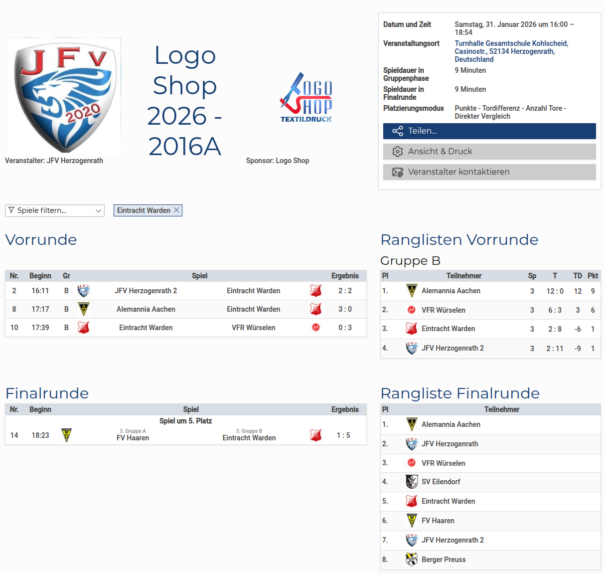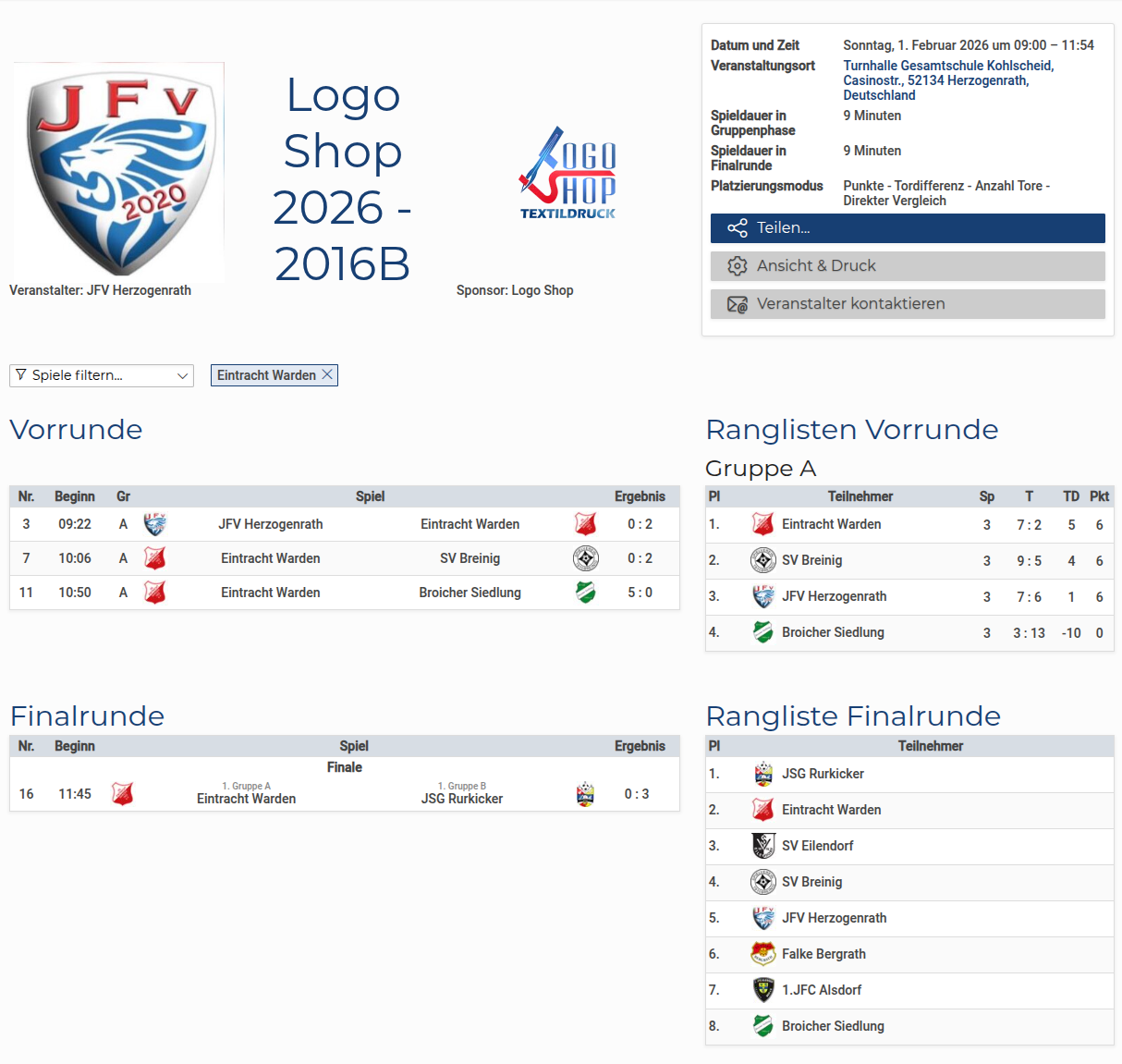 Die U10-2 der Eintracht Warden erreichte beim Hallenturnier in Herzogenrath einen hervorragenden zweiten Platz. In der Vorrunde startete das Team mit einem spielerisch überzeugenden 2:0-Sieg gegen den Gastgeber aus Herzogenrath. Im zweiten Gruppenspiel zeigte die Mannschaft erneut eine gute Leistung, musste sich dem SV Breinig jedoch trotz vieler Chancen mit 0:2 geschlagen geben.